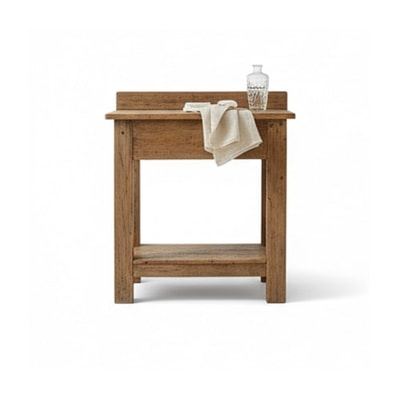 Someone stopped here to wash her hands, leaving the linen to fall where it may. The water reflects the final honeyed light slanting through the window—almost gone now, that golden week. Recreate the feeling with textured walls, reclaimed wood, and aged brass fixtures.