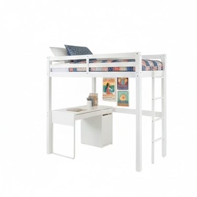 Sunlight streams through the window, illuminating dust motes dancing above the desk as a sleek shadow settles in to watch. A quiet hum of anticipation before the next adventure begins. A lofted bed with string lights, cozy rug, and playful art adds character and charm to this inspiring space.