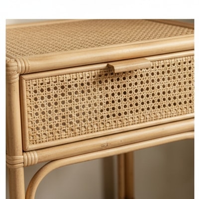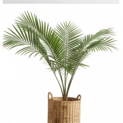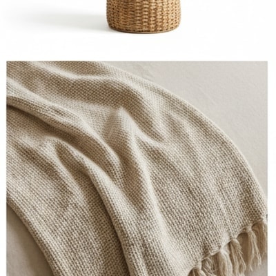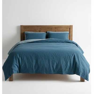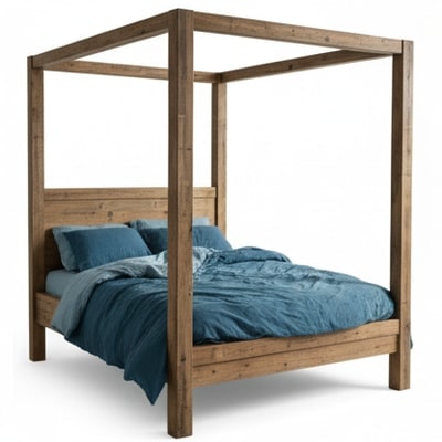 The sun paints the wall with palm fronds while a quiet stillness hums in the air. Crumpled wrapping paper hints at a celebration just past, a memory still unfolding. A wooden four-poster bed is draped in textured blue linens, complemented by rustic wood accents and a handwoven basket, creating an atmosphere of serene comfort.