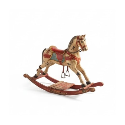 A rocking horse waits patiently for a rider, bathed in the gentle glow of a sunlit afternoon. High above, a watchful eye observes the timeless scene, a quiet guardian of cherished moments. Weathered brick, warm woods, and a collection of well-loved toys create a nostalgic and inviting atmosphere.