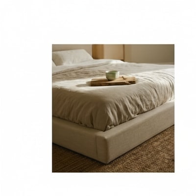 Quiet light, the world just beyond the window dissolving into soft focus. A moment suspended, intention blooming. Linen bedding, a woven rug, natural wood tones, and an abundance of soft light create a space for quiet contemplation.