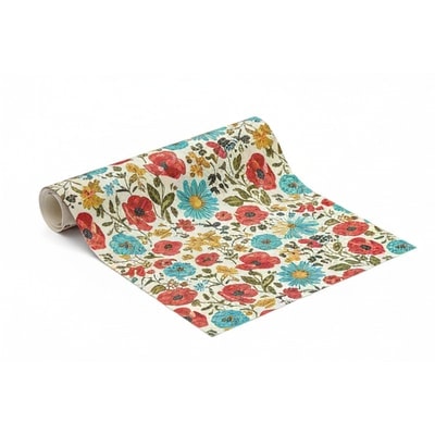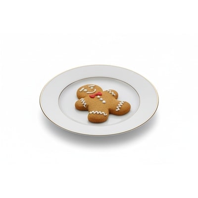 A half-eaten gingerbread man sits waiting for no one. Shards of vibrant paper litter the floor like fallen confetti, the joyful remnants of a celebration now quiet. Retro floral wallpaper meets bold black and white tiling, offset by a red tulip table, creating a playful, nostalgic atmosphere.